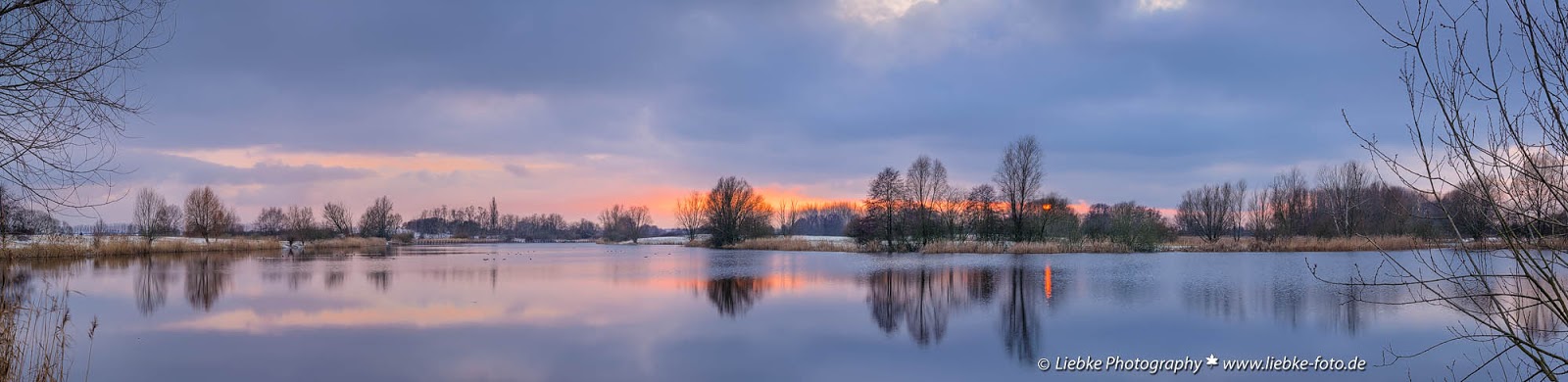 Nach den vielen Regentagen in der letzten Zeit und dem damit verbundenen Grau-in-grau-Wetter war der letzte Sonntag in jeder Hinsicht ein Lichtblick. Es war schön kalt, es lag eine schmale frische Schneedecke und es gab Licht am Himmel und ein wenig blauer Himmel lugte dann und wann durch die Wolken. Das musste ich zum fotografieren nutzen und fuhr in eine meiner liebsten Gegenden, in den Oberkrämer nördlich von Berlin. Am Mühlensee bei Vehlefanz wollte ich mein Stativ mit Kamera aufstellen und neue Panoramen aufnehmen. Dabei wollte ich gleich mal sehen wieviel Farbe meine neue D800 aus den doch recht monochromen “Angebot” herausholt. Am Parkplatz vor dem See war schon Hochbetrieb und in der Gegend nutzten viele die Möglichkeit zu einen Spaziergang mit Hund an der frischen Luft. Motive hatte ich schnell ausgemacht und genauso schnell stellte sich wieder das vertraute Gefühl etwas schönes herzustellen ein. Mit der D800 habe ich nun den Vorteil durch die hohe Megapixelzahl meine Panoramen zum großen Teil aus Querformataufnahmen zusammensetzen zu können. Dadurch benötige ich eben weniger Einzelaufnahmen und bekomme trotzdem die Größe (sogar etwas größer) wie mit meiner D700 und Einzelaufnahmen im Hochformat. Krönender Abschluss war dann für mich die letzte Abendaufnahme von der anderen Seeseite. Das Warten hatte sich gelohnt, für einen Moment lugte sogar der tiefrote Sonnenball durch Wolken und Baumgeäst und brachte eine schöne Spiegelung in den See. Eine Ausbeute von 4 guten Panoramen an einem Nachmittag, was kann man mehr erwarten? Drei davon möchte ich Euch hier gern zeigen. Klickt einfach auf das Bild, dann könnt Ihr es in guter Größe genießen.