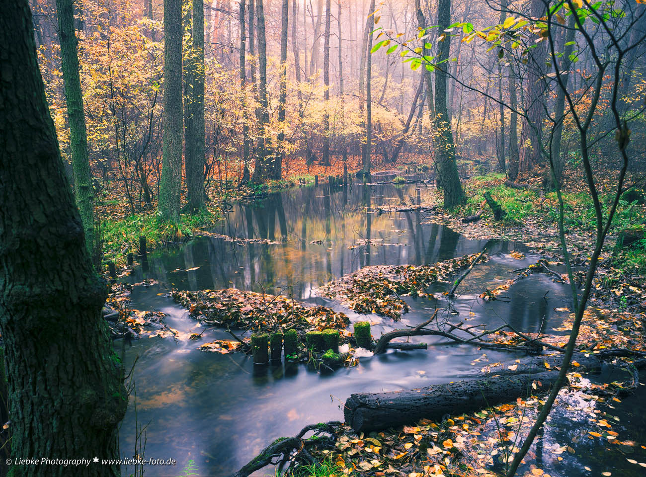 Länger hatte ich mir schon den Herbstbesuch im Briesetal, nördlich von Berlin, mit meiner D800, Rucksack und Stativ, vorgenommen aber tagesaktuelle Produktionen und viele Termine zwangen mich doch mein Vorhaben weiter nach hinten zu verschieben. Das Wunschwetter dazu wäre feucht mit feinem Nieselregen und/oder Nebel gewesen. Aus Erfahrung weiß ich dass dann alle Farben um ein Vielfaches leuchten und somit in den Bildern die Hauptdarsteller werden. Um 1993 war ich in der Gegend schon einmal mit meiner damals gerade erst erworbenen Großbildkamera der Marke Linhof-Technika, schwerem Stativ, drei Objektiven und dem unvermeidlichen schwarzen Tuch unterwegs. Dabei war mir auf 9x12cm Großbild-Farbnegativfilm der Marke Kodak Typ VPL unter anderem ein Bild gelungen was mir noch heute sehr gut gefällt.